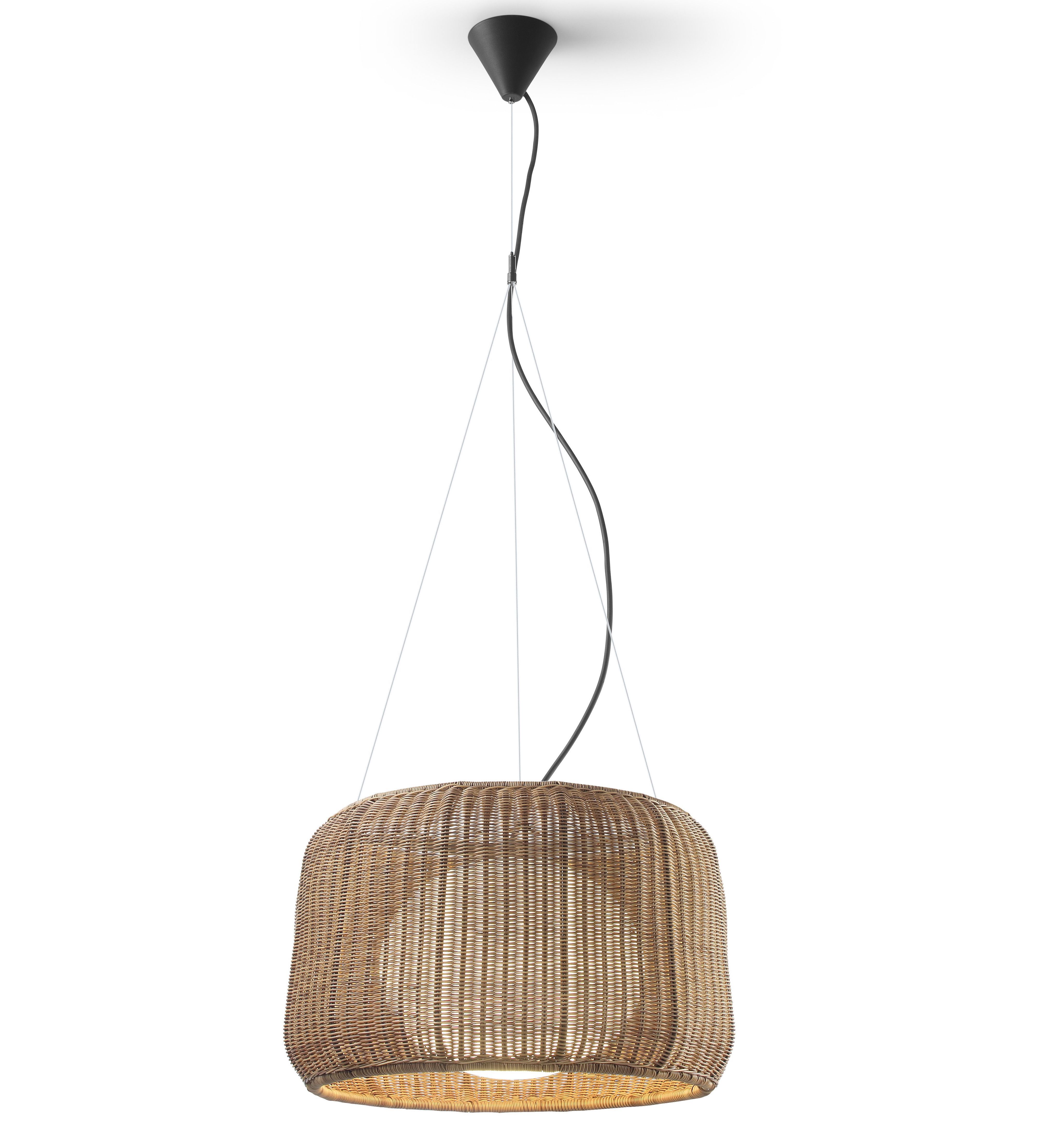 Fora is a product designed to illuminate warm outdoor spaces. Light source is protected by an elliptical medium intensity and U.V. resistant polythene globe, which grants a water tight electrical fixture. The shade is made of synthetic wicker; making it highly resistant to weathering while casting a pleasant diffuse light.